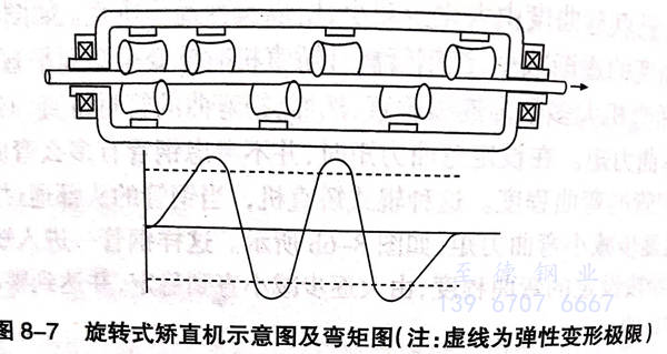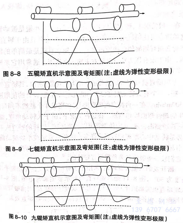 圖8-13是(shi)通(tong)過對(dui)十輥(gun)矯直機的調整,使(shi)之具有(you)三個彎(wan)曲力矩(ju),由于彎(wan)曲次數多,矯直質量會更(geng)好。