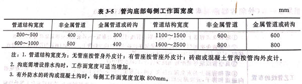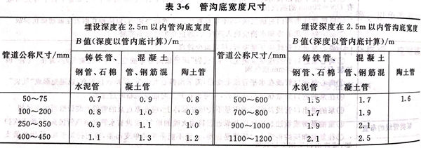 溝槽底(di)邊的(de)(de)(de)寬(kuan)度(du)應根據方(fang)便施工(gong)和減(jian)少工(gong)作(zuo)(zuo)量的(de)(de)(de)原(yuan)則確定。當施工(gong)開挖(wa)困難時,可適當減(jian)小,但考(kao)慮到溝底(di)管(guan)道(dao)施工(gong)操作(zuo)(zuo)的(de)(de)(de)需(xu)要,溝底(di)管(guan)子每側的(de)(de)(de)寬(kuan)度(du)不應小于表3-5的(de)(de)(de)要求,且溝底(di)最(zui)小總寬(kuan)度(du)不應小于表3-6的(de)(de)(de)規定。