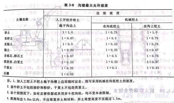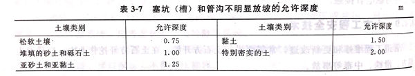 ①. 當土(tu)壤(rang)濕(shi)度(du)正(zheng)常、土(tu)質良好且無地(di)下水(shui)影響(xiang),若開(kai)挖(wa)(wa)深(shen)度(du)不(bu)超(chao)過表3-7的(de)規定(ding)時,可(ke)不(bu)設支撐(cheng),也不(bu)必明(ming)顯放坡(po),若開(kai)挖(wa)(wa)深(shen)度(du)超(chao)過表3-7的(de)規定(ding),可(ke)根(gen)據土(tu)質和施工的(de)具體情況參照表3-8的(de)規定(ding)放坡(po)。