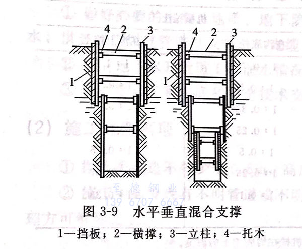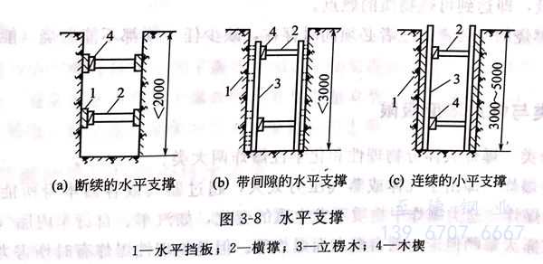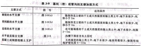 ②. 場地(di)條件限(xian)制挖方(fang)不允許(xu)放坡時(shi),則(ze)應采用支(zhi)撐(cheng)加(jia)固。支(zhi)撐(cheng)好一(yi)(yi)層(ceng)(ceng)下挖一(yi)(yi)層(ceng)(ceng)。支(zhi)撐(cheng)的加(jia)固方(fang)法可參照表3-9及圖3-8、圖3-9。