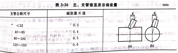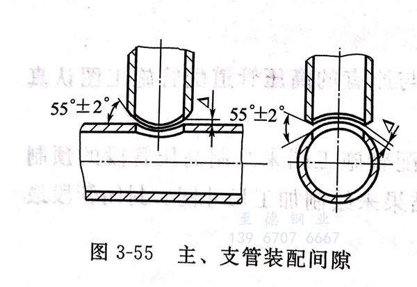 三通的主、支(zhi)(zhi)(zhi)管應(ying)按圖:3-55所示下料(liao)劃線,然后(hou)加工支(zhi)(zhi)(zhi)管的“馬鞍形”及圓滑過渡(du)的坡(po)口(kou)。主管應(ying)按支(zhi)(zhi)(zhi)管實際內(nei)徑用電鉆開孔(kong)(不能用氣(qi)割開孔(kong)),孔(kong)壁應(ying)平整、光滑,孔(kong)徑誤差(cha)為士(0.2~0.5)mm,孔(kong)的中心線應(ying)與主管中心線相交并(bing)垂(chui)直(zhi)。主、支(zhi)(zhi)(zhi)管結合處應(ying)嚴(yan)密吻(wen)合,間隙均勻,并(bing)做出定位標記,以便裝(zhuang)配。裝(zhuang)配時支(zhi)(zhi)(zhi)管內(nei)徑必須對(dui)正主管孔(kong)口(kou),錯孔(kong)量不應(ying)大于(yu)0.5mm.主、支(zhi)(zhi)(zhi)管垂(chui)直(zhi)度總偏差(cha)量應(ying)小于(yu)表3-26的規定,其間隙=1.5~4mm,坡(po)口(kou)角度為55°±2°,其他部(bu)位坡(po)口(kou)角度以圓滑過渡(du)為宜,如圖3-55所示,點焊(han)定位復查后(hou),再正式焊(han)接。