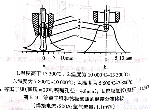 等(deng)離子(zi)弧(hu)(hu)(hu)的弧(hu)(hu)(hu)柱溫度(du)高(gao),能量(liang)密度(du)大(da)。從圖5-9和圖5-10可以看出,等(deng)離子(zi)弧(hu)(hu)(hu)對焊件加熱集中(zhong),熔透力強(qiang),焊接時速度(du)要比(bi)氬弧(hu)(hu)(hu)焊快得多(duo),從而(er)可提高(gao)焊接生產效率。普通鎢極(ji)氬弧(hu)(hu)(hu)的最高(gao)溫度(du)為10000K~24000K,能量(liang)密度(du)小于10kW/c㎡;而(er)等(deng)離子(zi)弧(hu)(hu)(hu)的溫度(du)可高(gao)達(da)24000K~50000K,能量(liang)密度(du)可達(da)100kW/c㎡~1000kW/c㎡.