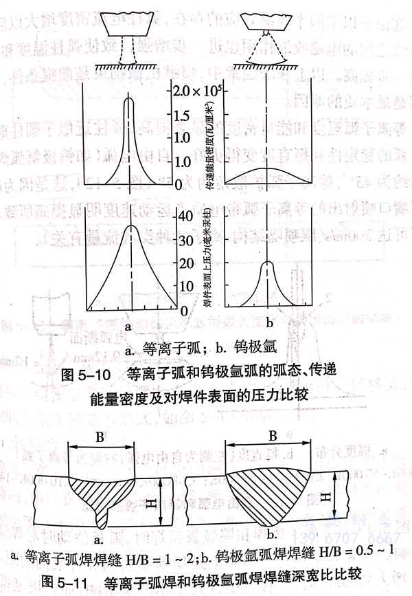 因此,等離子弧(hu)焊的焊縫截面(mian)形狀較(jiao)窄,深(shen)(shen)寬(kuan)比(bi)大,無(wu)疑焊件變形就小。等離子弧(hu)焊和鎢極氬弧(hu)焊深(shen)(shen)寬(kuan)比(bi)比(bi)較(jiao)見(jian)圖5-11。