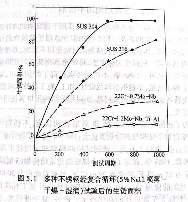 此外,不(bu)(bu)銹(xiu)(xiu)(xiu)鋼(gang)(gang)(gang)(gang)的(de)(de)(de)(de)裸露(lu)使(shi)用(yong)(yong)受到人們(men)的(de)(de)(de)(de)喜愛,但(dan)(dan)對(dui)于(yu)(yu)(yu)在容易腐蝕的(de)(de)(de)(de)沿海地區的(de)(de)(de)(de)建(jian)(jian)筑物(wu)來說(shuo),SUS304不(bu)(bu)銹(xiu)(xiu)(xiu)鋼(gang)(gang)(gang)(gang)的(de)(de)(de)(de)耐大氣腐蝕性不(bu)(bu)是很好,推薦(jian)使(shi)用(yong)(yong)SUS316不(bu)(bu)銹(xiu)(xiu)(xiu)鋼(gang)(gang)(gang)(gang).但(dan)(dan)是,因(yin)為(wei)成(cheng)本增(zeng)高,所(suo)以在1982年(nian)(nian)(nian)研制(zhi)開發了奧氏(shi)(shi)體(ti)(ti)不(bu)(bu)銹(xiu)(xiu)(xiu)鋼(gang)(gang)(gang)(gang)(NAS8AW,18Cr-8Ni-0.4Mn-0.4Mo-0.13N-S≤0.0010),這(zhe)(zhe)(zhe)種鋼(gang)(gang)(gang)(gang)與304不(bu)(bu)銹(xiu)(xiu)(xiu)鋼(gang)(gang)(gang)(gang)的(de)(de)(de)(de)成(cheng)本相(xiang)近,與316不(bu)(bu)銹(xiu)(xiu)(xiu)鋼(gang)(gang)(gang)(gang)的(de)(de)(de)(de)耐大氣腐蝕性相(xiang)近,并且添(tian)加氮、含硫低。之后,由鑄模而成(cheng)的(de)(de)(de)(de)22Cr-0.7Mo-Nb鋼(gang)(gang)(gang)(gang),通過作(zuo)為(wei)建(jian)(jian)筑外部裝(zhuang)潢材(cai)料特別是作(zuo)為(wei)裸露(lu)使(shi)用(yong)(yong)的(de)(de)(de)(de)屋(wu)頂材(cai)料而引(yin)起了人們(men)的(de)(de)(de)(de)注(zhu)意。這(zhe)(zhe)(zhe)種材(cai)料比(bi)用(yong)(yong)于(yu)(yu)(yu)汽車外部裝(zhuang)潢的(de)(de)(de)(de)19Cr-0.5Cu-Nb鋼(gang)(gang)(gang)(gang)(SUS430J1L)更(geng)加適用(yong)(yong)于(yu)(yu)(yu)嚴(yan)酷的(de)(de)(de)(de)環境中。1991年(nian)(nian)(nian)之前,研制(zhi)開發出了如(ru)表5.2所(suo)示(shi)(shi)的(de)(de)(de)(de)20%~22%Cr-0.5%~0.9%Mo的(de)(de)(de)(de)高純度鐵(tie)素體(ti)(ti)系(xi)不(bu)(bu)銹(xiu)(xiu)(xiu)鋼(gang)(gang)(gang)(gang)。1989年(nian)(nian)(nian)建(jian)(jian)的(de)(de)(de)(de)千葉縣的(de)(de)(de)(de)商品展覽會場中也(ye)大量(liang)使(shi)用(yong)(yong)了沒(mei)(mei)有(you)(you)(you)涂飾的(de)(de)(de)(de)22Cr-0.8Mo-0.5Cu-Nb鋼(gang)(gang)(gang)(gang)和22Cr-0.9Mo-0.5Cu-Nb鋼(gang)(gang)(gang)(gang)。但(dan)(dan)是,在沿海地區,因(yin)為(wei)這(zhe)(zhe)(zhe)些(xie)(xie)鋼(gang)(gang)(gang)(gang)沒(mei)(mei)有(you)(you)(you)涂飾,容易生銹(xiu)(xiu)(xiu),所(suo)以各(ge)公司研制(zhi)開發了如(ru)表5.3所(suo)示(shi)(shi)的(de)(de)(de)(de)鉬含量(liang)(22%~24%Cr-1%~2%Mo)更(geng)高的(de)(de)(de)(de)鐵(tie)素體(ti)(ti)系(xi)不(bu)(bu)銹(xiu)(xiu)(xiu)鋼(gang)(gang)(gang)(gang),并從1994年(nian)(nian)(nian)以后,實際應用(yong)(yong)于(yu)(yu)(yu)屋(wu)頂上。把這(zhe)(zhe)(zhe)些(xie)(xie)Cr-Mo鐵(tie)素體(ti)(ti)系(xi)不(bu)(bu)銹(xiu)(xiu)(xiu)鋼(gang)(gang)(gang)(gang)和已有(you)(you)(you)的(de)(de)(de)(de)奧氏(shi)(shi)體(ti)(ti)系(xi)不(bu)(bu)銹(xiu)(xiu)(xiu)鋼(gang)(gang)(gang)(gang)的(de)(de)(de)(de)耐大氣腐蝕性加以對(dui)比(bi)試驗(5%NaCl 噴霧(wu)→干燥→濕(shi)潤),其(qi)結果如(ru)圖5.1所(suo)示(shi)(shi)。也(ye)有(you)(you)(you)鐵(tie)素體(ti)(ti)系(xi)不(bu)(bu)銹(xiu)(xiu)(xiu)鋼(gang)(gang)(gang)(gang)比(bi)奧氏(shi)(shi)體(ti)(ti)系(xi)不(bu)(bu)銹(xiu)(xiu)(xiu)鋼(gang)(gang)(gang)(gang)的(de)(de)(de)(de)線膨脹系(xi)數小(xiao)的(de)(de)(de)(de)情況(kuang),這(zhe)(zhe)(zhe)特別適用(yong)(yong)于(yu)(yu)(yu)長尺屋(wu)頂,而且適用(yong)(yong)情況(kuang)逐漸有(you)(you)(you)所(suo)增(zeng)加。