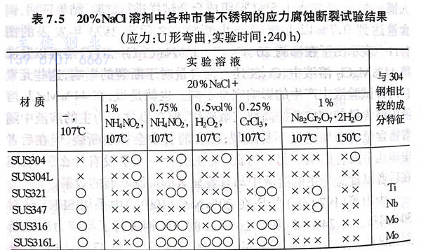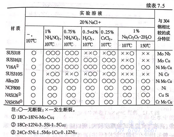 采用各種市售奧氏體不銹鋼,添加各種氧化劑后在20%NaCl中進行試驗,其結果如表7.5 所示。從表中可以看出:在市售鋼當中,銅的效果也非常明顯;還有,復合添加了鉬和銅的316J1鋼只有在1%Na2Cr2O7·2H2O的溶液中才會發生斷裂;鎳含量較高的V16A(18Cr-18Ni-Mo-Cu鋼)、Alloy20、Incoloy800在任何條件下都不會發生斷裂。這和實際使用效果是一致的。