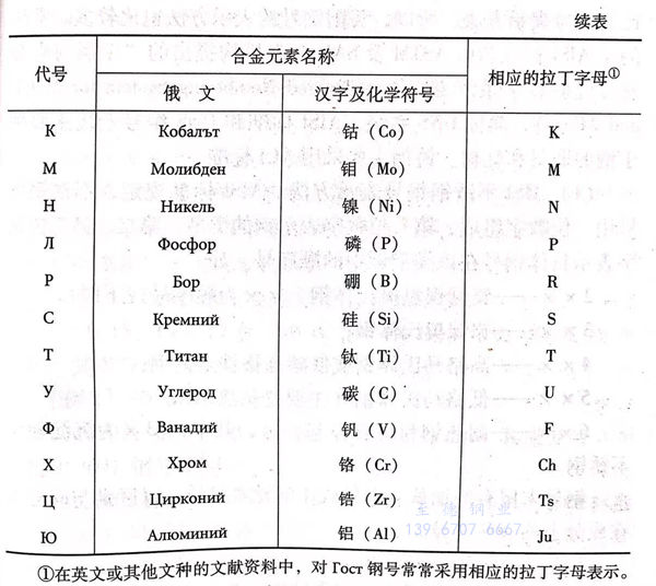 按照GOST 標準,不銹鋼鋼號是由數字表示的含碳量,由合金元素符號表示的合金元素及合金元素后面用數字表示的含量三部分組成,但合金元素符號采用的不是國際通用的化學元素符號,而是按俄文字母表示的符號。