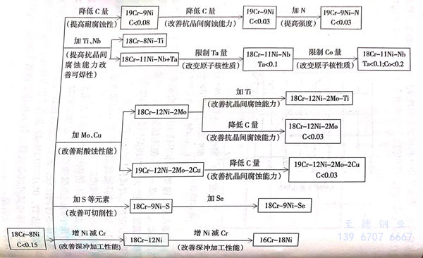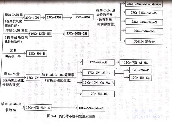 式中各元素(su)符號分(fen)別表示該元素(su)在(zai)鋼(gang)(gang)中的質(zhi)量(liang)(liang)百分(fen)數含量(liang)(liang)。在(zai)18-8鋼(gang)(gang)基礎上(shang),奧氏(shi)體不銹鋼(gang)(gang)的發展(zhan)變化過(guo)程見(jian)圖(tu)3-4。
