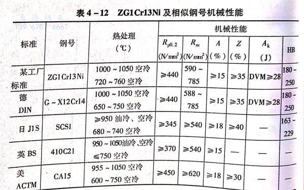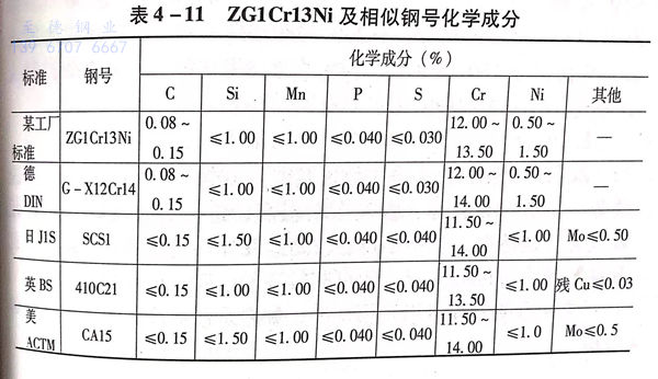 ZG1Cr13Ni及國外一(yi)些相似材料(liao)的(de)成分和性能標準參見表(biao) 4-11 和 表(biao) 4-12。