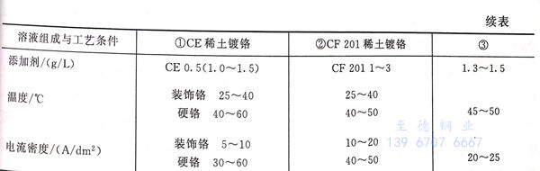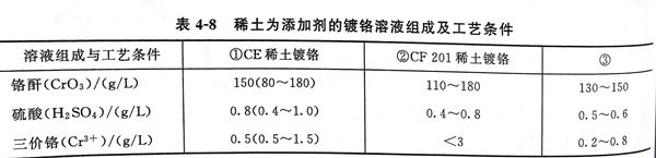 a. 采用稀土為添加劑的(de)鍍鉻(ge),可獲得較均(jun)勻的(de)鉻(ge)層,使用較低的(de)鉻(ge)酐和電流密度,其溶液組成和工藝條件見(jian)表(biao) 4-8 。