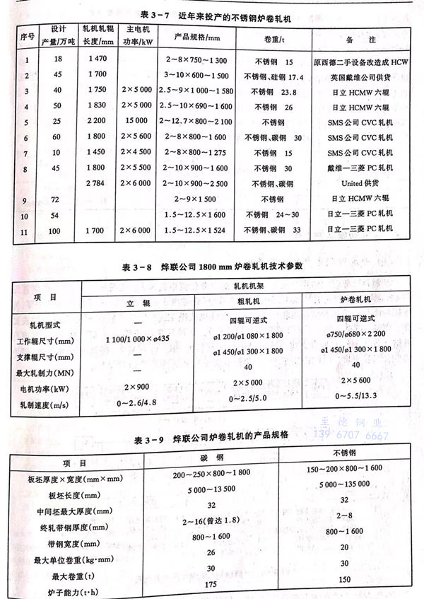 爐(lu)卷(juan)軋(ya)(ya)機(ji)(ji)(ji)是一種(zhong)(zhong)帶(dai)(dai)有爐(lu)內卷(juan)取機(ji)(ji)(ji)的(de)可(ke)逆式熱軋(ya)(ya)帶(dai)(dai)鋼(gang)軋(ya)(ya)機(ji)(ji)(ji)。這種(zhong)(zhong)軋(ya)(ya)機(ji)(ji)(ji)特別適合于軋(ya)(ya)制(zhi)變形(xing)抗力大(da)、熱塑性低的(de)不銹鋼(gang)、高(gao)溫合金、硅(gui)鋼(gang)等鋼(gang)種(zhong)(zhong),產(chan)量(liang)一般(ban)小于100萬噸(dun)。這種(zhong)(zhong)軋(ya)(ya)機(ji)(ji)(ji)在(zai)1987年以后(hou)采用了(le)熱連軋(ya)(ya)機(ji)(ji)(ji)的(de)一系列成熟有效(xiao)的(de)新(xin)工藝、新(xin)設備(bei),使傳(chuan)統(tong)的(de)爐(lu)卷(juan)軋(ya)(ya)機(ji)(ji)(ji)在(zai)產(chan)品質量(liang)、厚度(du)規格和(he)成材(cai)率等方(fang)面(mian)都有了(le)重大(da)突(tu)破(po)。由(you)于爐(lu)卷(juan)軋(ya)(ya)機(ji)(ji)(ji)投資約(yue)為連軋(ya)(ya)機(ji)(ji)(ji)的(de)1/3,因(yin)此(ci)在(zai)生(sheng)(sheng)產(chan)成本上也具有很(hen)強的(de)優(you)勢(shi),近10年來(lai)世(shi)界共有十幾套(tao)爐(lu)卷(juan)軋(ya)(ya)機(ji)(ji)(ji)生(sheng)(sheng)產(chan)高(gao)質量(liang)的(de)不銹鋼(gang),見表3-7~表3-10.爐(lu)卷(juan)軋(ya)(ya)機(ji)(ji)(ji)的(de)精軋(ya)(ya)由(you)于是在(zai)一個機(ji)(ji)(ji)架上經3~7道次完成的(de),所(suo)以帶(dai)(dai)鋼(gang)斷(duan)面(mian)尺寸精度(du)和(he)板形(xing)控制(zhi)較難,一般(ban)應選用中凸(tu)值控制(zhi)能力較高(gao)的(de)軋(ya)(ya)機(ji)(ji)(ji),如CVC和(he)PC軋(ya)(ya)機(ji)(ji)(ji),其(qi)使用效(xiao)果較好。