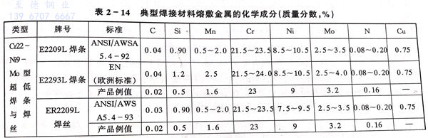 焊接雙相不銹鋼和超級雙相不銹鋼(gang)的焊材均是配套設計的(詳見表2-13和表2-14)。手工焊用的涂藥焊條既可以用鈦型藥皮焊條,也可以用堿性藥皮焊條。堿性藥皮的焊條對全位置的焊接更適宜一些,而鈦型焊條工藝性優良,在幾乎所有的實際應用中都可獲得滿意的效果。
