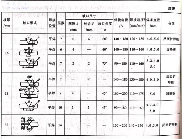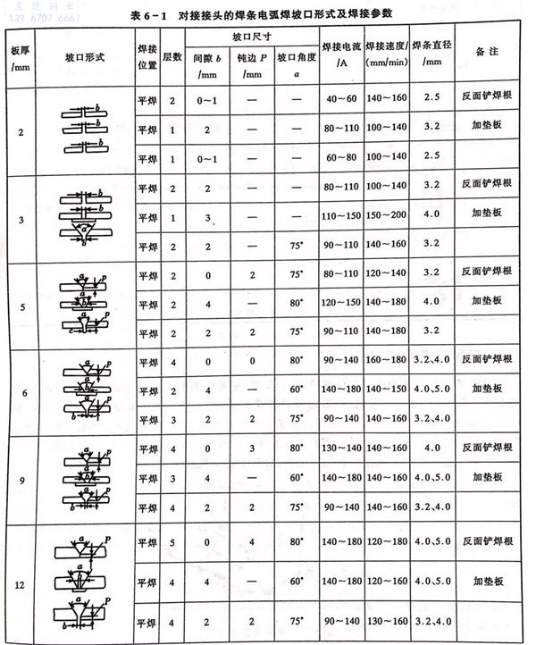 不(bu)銹鋼焊接(jie)的(de)坡(po)(po)口(kou)(kou)選(xuan)擇(ze)很關鍵。坡(po)(po)口(kou)(kou)形(xing)式(shi)的(de)選(xuan)擇(ze)原則(ze)是保證焊接(jie)接(jie)頭質量,保證焊透和盡量避免產生焊接(jie)缺(que)陷和焊接(jie)變形(xing),盡可能減少焊接(jie)材料(liao)的(de)消耗量,同時必須(xu)確保工藝的(de)可操作性。在板厚小(xiao)于(yu)(yu)3mm時不(bu)用開坡(po)(po)口(kou)(kou);當板厚大于(yu)(yu)3mm時可選(xuan)用V形(xing)坡(po)(po)口(kou)(kou);厚度更大(20mm以上)時可用X形(xing)坡(po)(po)口(kou)(kou)或U形(xing)坡(po)(po)口(kou)(kou)。表6-1是常見焊條(tiao)電弧焊坡(po)(po)口(kou)(kou)形(xing)式(shi)。