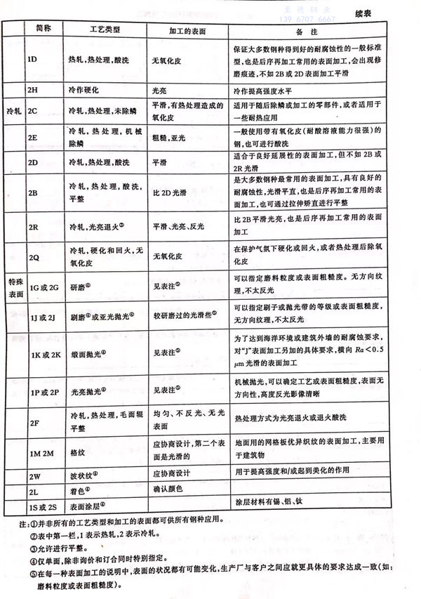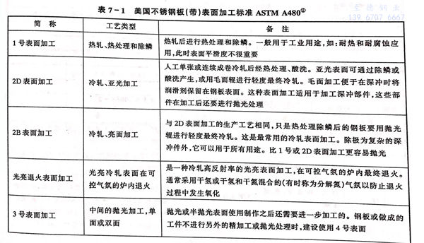 表(biao)(biao)(biao)7-1至表(biao)(biao)(biao)7-3顯示出了有關標準中(zhong)的(de)許(xu)多種板材的(de)表(biao)(biao)(biao)面(mian)加工(gong)。其中(zhong)大(da)量(liang)應用的(de)是2B或(huo)2R(有時稱為(wei)BA或(huo)2BA)和4號表(biao)(biao)(biao)面(mian)加工(gong)。