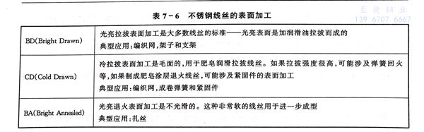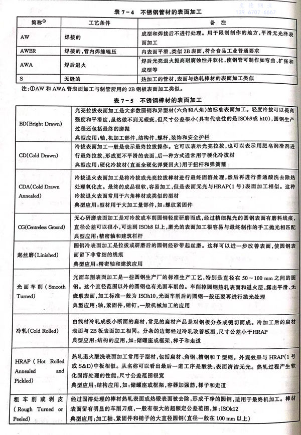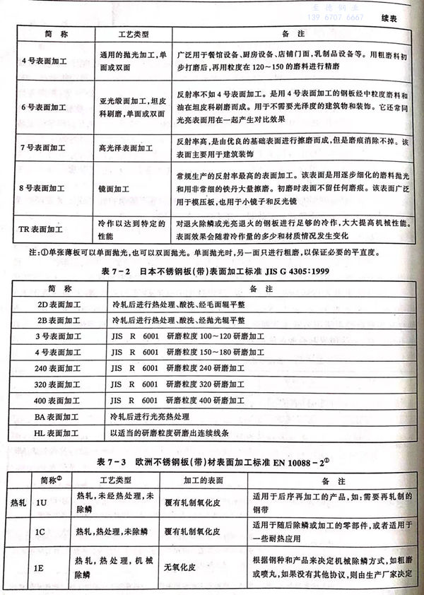 從最早的美國(guo)(guo)ASTM標準(表(biao)(biao)(biao)(biao)7-1)、借薦日(ri)本JIS標準(表(biao)(biao)(biao)(biao)7-2)、新(xin)發展(zhan)的歐洲EN標準(表(biao)(biao)(biao)(biao)7-3)及表(biao)(biao)(biao)(biao)7-4、表(biao)(biao)(biao)(biao)7-5、表(biao)(biao)(biao)(biao)7-6中可以看到已(yi)定型(xing)的各(ge)類不(bu)銹(xiu)鋼的表(biao)(biao)(biao)(biao)面加(jia)工(gong)(gong),當(dang)然(ran)也有些較新(xin)的不(bu)銹(xiu)鋼表(biao)(biao)(biao)(biao)面加(jia)工(gong)(gong)尚未(wei)列入各(ge)國(guo)(guo)和(he)地區標準。當(dang)前,隨著不(bu)銹(xiu)鋼在應用領域的不(bu)斷(duan)拓寬,一些國(guo)(guo)家和(he)企(qi)業(ye)已(yi)研制開發出更多更新(xin)的表(biao)(biao)(biao)(biao)面加(jia)工(gong)(gong)方法。