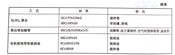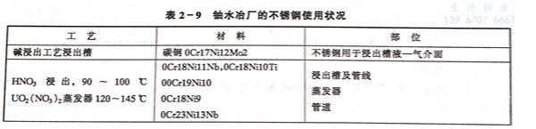 鈾礦經過堿或酸洗→溶劑浸出→溶劑萃取→脫硝工序,最終形成U3O8.在上述工藝過程中的不銹鋼材料使用情況見表2-9。由于用堿浸出,腐蝕性較弱,使用普通鋼即可,但液一氣介面處使用316不銹鋼制作擋板,可防止硫化物飛濺而產生點蝕。在使用硝酸浸出時,使用抗晶間腐蝕的18-8型奧氏體不銹鋼。當用硫酸浸出時,需使用含鉬或鉬銅復合的Cr-Ni奧氏體不銹鋼,在存在磨蝕的條件應使用沉淀強化的奧氏體不銹鋼。