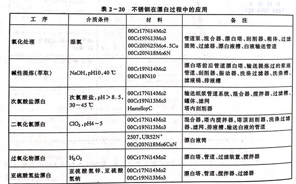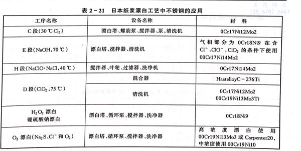 00Cr20Ni25Mo4.5Cu,00Cr20Ni18Mo6CuN,超級雙相不銹鋼以及鎳基耐蝕合等(deng)高(gao)擋材料均得到普遍(bian)應(ying)用,可根據介質的實際條(tiao)件進行(xing)合理(li)選擇。不銹鋼在漂白工藝(yi)過程(cheng)的使用見表2-20和表2-21。