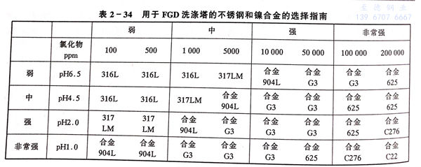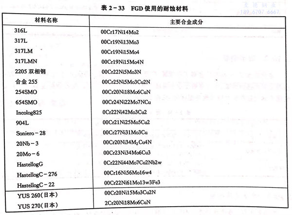 在煙氣脫硫裝置中所使用的耐蝕材料涉及到一般不銹鋼、高性能不銹鋼以及鎳基耐蝕合金,見表2-33.可根據介質條件進行合理選擇。通常按表2-34所列原則選擇煙氣脫硫不同裝置的耐蝕材料。