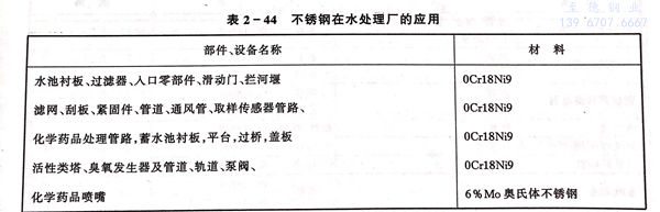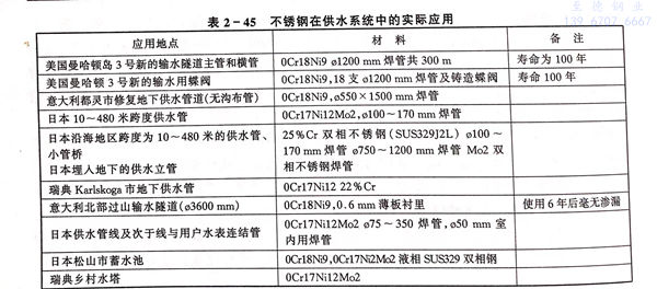 不銹鋼在水處理廠、供水系統以及室內水管中的應用的冶金產品為不(bu)銹鋼管,管接頭、法蘭、閥門和緊固件等。實際應用狀況見表2-44、表2-45。