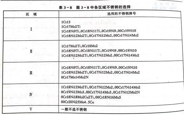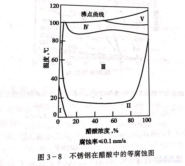 含Mo的0Cr18Mo2和316不銹鋼可耐沸騰溫度以下任何濃度的醋酸腐蝕,在純醋酸中適宜不銹鋼的選擇見圖3-8和表3-8.