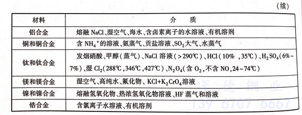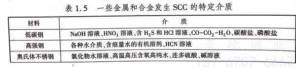 只有在特定的腐(fu)(fu)蝕(shi)(shi)介質中含有某些對發生(sheng)應力(li)腐(fu)(fu)蝕(shi)(shi)有特效作用(yong)的離子、分子時才會發生(sheng)應力(li)腐(fu)(fu)蝕(shi)(shi)。這種特定的腐(fu)(fu)蝕(shi)(shi)劑并不一定要大量存在,而(er)且往(wang)(wang)往(wang)(wang)濃度(du)很低。表1.5列出了(le)一些金屬和合金發生(sheng)應力(li)腐(fu)(fu)蝕(shi)(shi)的特定介質。