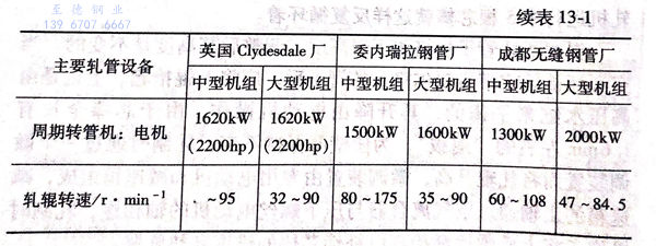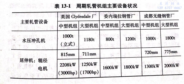 在(zai)1958年(nian)(nian)前(qian)后除(chu)了Phoenix 鋼鐵公(gong)司的這一套采用Calmes軋管(guan)(guan)工藝的周期軋管(guan)(guan)機組以外,還有英國 Clydesdale(1947年(nian)(nian)、1956年(nian)(nian))、委內瑞拉(la)鋼管(guan)(guan)公(gong)司(1958年(nian)(nian))和(he)我國的成都(dou)無(wu)縫(feng)(1958年(nian)(nian)、1965年(nian)(nian))等幾套周期軋管(guan)(guan)機組投產。其(qi)主要設(she)備狀況(kuang)如(ru)表13-1所示(shi)。