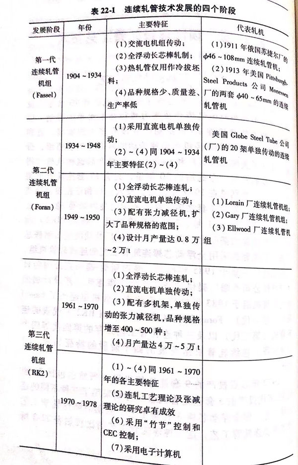 從Fassel軋機算起,長芯棒連續軋管機已有70余年的發展歷史。但受當時電氣傳動及張力減徑技術水平的限制,以致長芯棒連軋管機在20世紀初葉并沒有多大的發展。直到1950年,設有張力減徑機和單獨傳動的兩套連軋管機組,分別安裝在了美國Lorain不銹鋼管廠和Gary不銹鋼管廠,在投產后這種軋機才得到進一步的發展。在此后的30年里,約有17套連軋管機組投入運行,特別是在1977年以后,投入運行和正在設計制造的連軋管機組就達8套之多。聯邦德國的曼內斯曼-德馬克公司在總結牟爾海姆1號、2號連軋管機組(RK1,RK2)設計、生產經驗的基礎上,向波蘭Jednosc 廠及我國寶山鋼鐵總廠提供了成套的采用全浮動芯棒連軋管工藝的連續軋管機組,寶鋼無縫廠一套于1985年投產。曼內斯曼-德馬克公司向日本新日鐵公司八幡不銹鋼管廠提供的按半浮動芯棒連軋工藝設計制造的連軋管機組于1983年投產,至此連軋管機組經歷了Fassel軋機(第一代)、Foran軋機(第二代)、以RK2為代表的連軋管機(第三代)以及三種連軋管工藝并存的第四代等四個發展階段。連續軋管機組發展的四個階段的特征如表22-1所示。