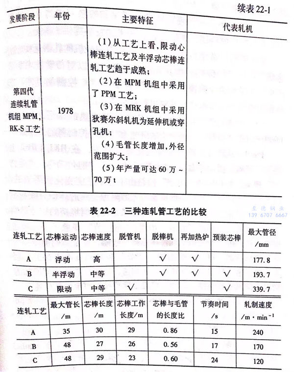 1972年(nian)以后投(tou)產的9套連軋(ya)(ya)管(guan)機組(當然也包括20世紀80年(nian)代投(tou)產的3套連軋(ya)(ya)管(guan)機組)分別(bie)采用了三種(zhong)不(bu)同(tong)的連軋(ya)(ya)管(guan)工藝(yi)(yi),即全浮動(dong)芯棒連軋(ya)(ya)管(guan)工藝(yi)(yi)、限(xian)動(dong)芯棒連軋(ya)(ya)管(guan)工藝(yi)(yi)及(ji)半(ban)浮動(dong)連軋(ya)(ya)管(guan)工藝(yi)(yi),這三種(zhong)連軋(ya)(ya)管(guan)工藝(yi)(yi)的比(bi)較如(ru)表22-2所示。
