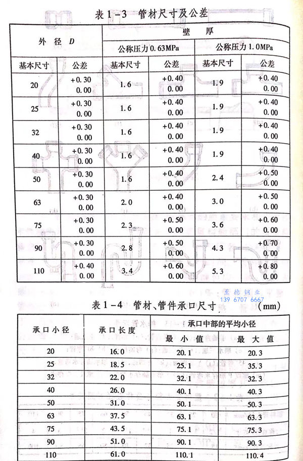 給水硬聚氯乙烯管(guan)(guan)(guan)道的(de)基本(ben)尺寸(cun)是以大(da)徑(jing)(jing)來表示的(de)(見表1-2).管(guan)(guan)(guan)材(cai)(cai)、管(guan)(guan)(guan)件(jian)壁越(yue)(yue)厚(hou)其公(gong)稱(cheng)壓力越(yue)(yue)高。管(guan)(guan)(guan)材(cai)(cai)現行(xing)國家產(chan)品等級較多,從安(an)全、耐久考慮(lv),用(yong)于(yu)建筑物(wu)內的(de)管(guan)(guan)(guan)材(cai)(cai)、管(guan)(guan)(guan)件(jian)公(gong)稱(cheng)壓力應采用(yong)1.6 MPa等級(大(da)徑(jing)(jing)≤25mm,小口徑(jing)(jing)的(de)管(guan)(guan)(guan)道公(gong)稱(cheng)壓力均采用(yong)1.6 MPa;大(da)口徑(jing)(jing)的(de)管(guan)(guan)(guan)道可適當降低公(gong)稱(cheng)壓力等級,但(dan)必須≥1.0 MPa)。表1-3為(wei)管(guan)(guan)(guan)材(cai)(cai)尺寸(cun)及公(gong)差,表1-4為(wei)管(guan)(guan)(guan)材(cai)(cai)、管(guan)(guan)(guan)件(jian)承口尺寸(cun)。