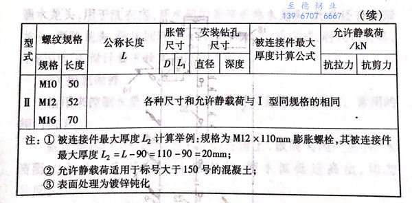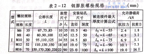 膨脹(zhang)(zhang)螺(luo)(luo)栓(shuan)全稱(cheng)為(wei)鋼膨脹(zhang)(zhang)螺(luo)(luo)栓(shuan),它是(shi)一(yi)種特殊螺(luo)(luo)紋(wen)連(lian)接件。型(xing)(xing)(xing)(普通型(xing)(xing)(xing))由沉頭螺(luo)(luo)栓(shuan)、脹(zhang)(zhang)管(guan)(guan)、平墊(dian)圈、彈簧(huang)墊(dian)圈和(he)六角螺(luo)(luo)母組成,如圖2-26所(suo)示(shi)。使(shi)用(yong)時(shi)先用(yong)沖擊鉆(zhan)在(zai)安(an)(an)裝(zhuang)位置鉆(zhan)一(yi)個相(xiang)(xiang)應(ying)尺寸的(de)(de)孔(kong),鉆(zhan)成的(de)(de)孔(kong)必須與(yu)構件表面(mian)垂直,并將孔(kong)內碎屑(xie)清除干凈(jing)。再把(ba)螺(luo)(luo)栓(shuan)、脹(zhang)(zhang)管(guan)(guan)裝(zhuang)人孔(kong)中,然后依次把(ba)構件(或設(she)備)平墊(dian)圈、彈簧(huang)墊(dian)圈套在(zai)螺(luo)(luo)栓(shuan)上面(mian),最后旋緊螺(luo)(luo)母,在(zai)旋緊螺(luo)(luo)母的(de)(de)同時(shi)把(ba)螺(luo)(luo)栓(shuan)逐漸拔起,螺(luo)(luo)栓(shuan)底(di)部(bu)呈錐(zhui)(zhui)形,將脹(zhang)(zhang)管(guan)(guan)逐步脹(zhang)(zhang)開與(yu)周圍磚體(ti)或混凝土固緊,使(shi)螺(luo)(luo)栓(shuan)、脹(zhang)(zhang)管(guan)(guan)、螺(luo)(luo)母、構件(或設(she)備)與(yu)墻體(ti)連(lian)接成一(yi)個整體(ti)。I型(xing)(xing)(xing)不同之(zhi)處是(shi)將沉頭螺(luo)(luo)栓(shuan)分(fen)成螺(luo)(luo)栓(shuan)和(he)錐(zhui)(zhui)形螺(luo)(luo)母兩個零件,可以安(an)(an)裝(zhuang)大型(xing)(xing)(xing)機器、設(she)備,使(shi)用(yong)方法與(yu)I型(xing)(xing)(xing)相(xiang)(xiang)同。鋼膨脹(zhang)(zhang)螺(luo)(luo)栓(shuan)規格見表2-12。