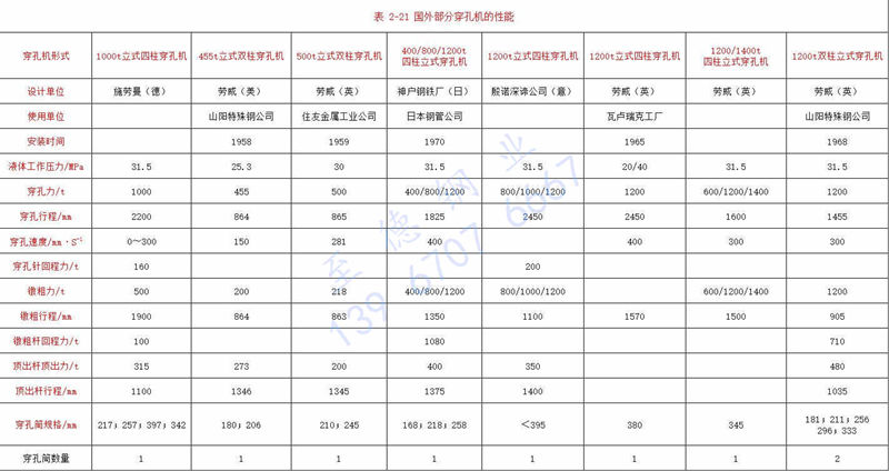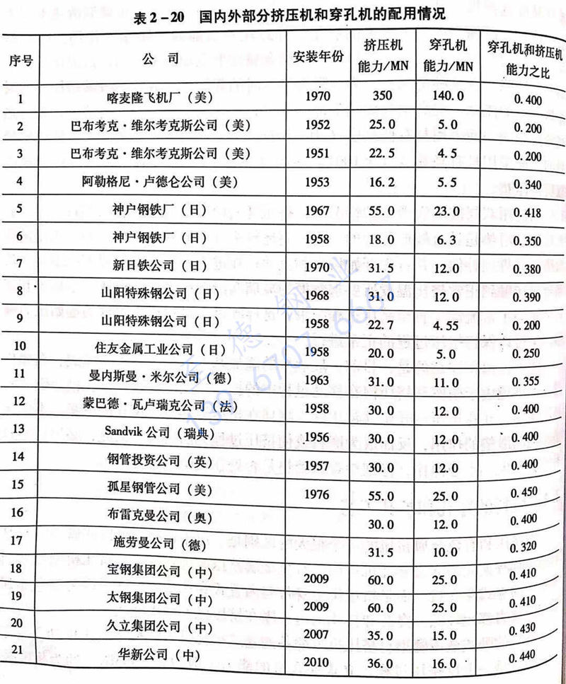 表(biao)2-20為(wei)國內外(wai)部分(fen)擠(ji)壓機(ji)與(yu)穿孔機(ji)的配(pei)用(yong)情況(kuang)。 表(biao)2-21為(wei)國外(wai)部分(fen)穿孔機(ji)的能力(li)。
