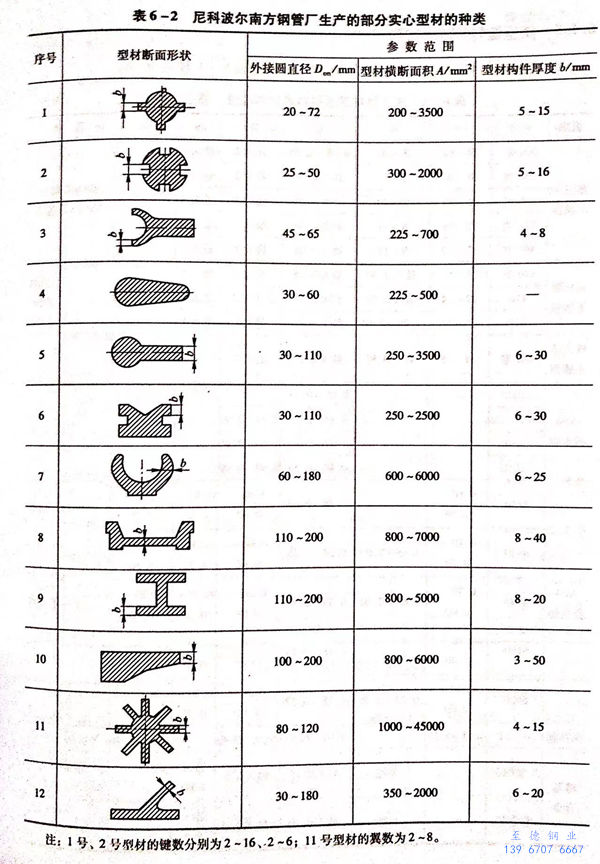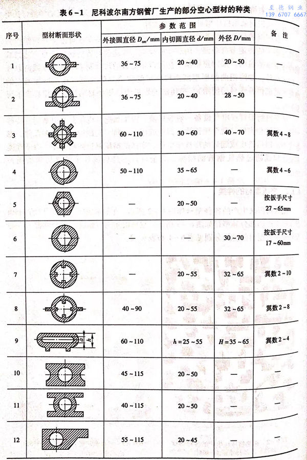 用熱擠壓法生產的各種型材如圖6-2所示。尼科波爾南方不銹鋼管廠(chang)的3150噸擠壓機生產的部分異型材如圖6-3所示。尼科波爾南方不銹鋼管廠生產的部分空心型材和實心型材的種類分別見表6-1和表6-2。
