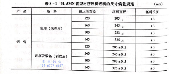 軋坯及(ji)鍛坯未剝(bo)皮和經(jing)剝(bo)皮后(hou)偏差均為±3.0mm。31.5MN(3150t)擠壓機用于管(guan)材、棒(bang)材及(ji)型材生產時對其坯料尺寸(cun)偏差的規定見表8-1.