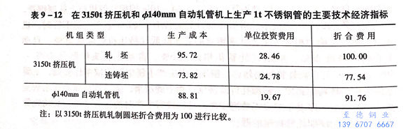 在(zai)3150t擠壓機組(zu)和ф140mm自動(dong)(dong)軋管(guan)(guan)(guan)機組(zu)上生(sheng)產1t不銹鋼管(guan)(guan)(guan)時(shi)的(de)主要技術經濟指標見表9-12.從(cong)表9-12可以看出,在(zai)自動(dong)(dong)軋管(guan)(guan)(guan)機組(zu)上生(sheng)產鋼管(guan)(guan)(guan)比在(zai)擠壓機組(zu)采(cai)用軋坯生(sheng)產鋼管(guan)(guan)(guan)有利(li);在(zai)擠壓機組(zu)采(cai)用連鑄(zhu)坯生(sheng)產不銹鋼管(guan)(guan)(guan)的(de)情況下,其生(sheng)產的(de)有效(xiao)性顯著(zhu)增加(jia),此時(shi)擠壓法比軋管(guan)(guan)(guan)法更有利(li)于(yu)生(sheng)產。3150t擠壓車(che)間(jian)(jian)和類似的(de)軋管(guan)(guan)(guan)車(che)間(jian)(jian)生(sheng)產碳素鋼管(guan)(guan)(guan)的(de)技術經濟指標見表9-13.