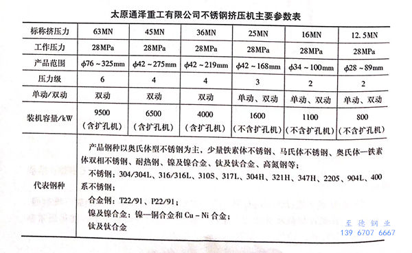 太原通澤重工有限公司設計制造的36MN不銹鋼管(guan)熱擠壓生產線于2010年8月21日在常熟華新特殊鋼有限公司熱試擠壓成功并投入使用。該生產線采用ф170mm、φ210mm、φ270mm、φ345mm擠壓筒系統,成功擠出φ51mm×4mm~ф244mm×20mm等數十種規格的鋼管產品,材質范圍覆蓋了“300系列”不銹鋼及904L不銹(xiu)鋼(gang)、800合金(jin)、811、825合金、UNSS92108 高氮鋼等特種合金和鈦合金。該生產線解決了以往穿孔機組無法涉及的材質領域,為擴大產品范圍提供了有力的平臺,對提高我國核電工業、石油化工、航空航天、艦船等特殊領域用管的質量具有積極的促進作用。