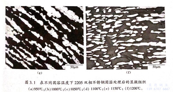 對2205雙(shuang)相不銹鋼進行不同溫度的固溶處理會導致2205雙(shuang)相不銹(xiu)鋼兩相組織的改變,進而導致其性能的差異,圖3.1是在不同溫度下2205雙相不銹鋼固溶處理后的微觀組織。