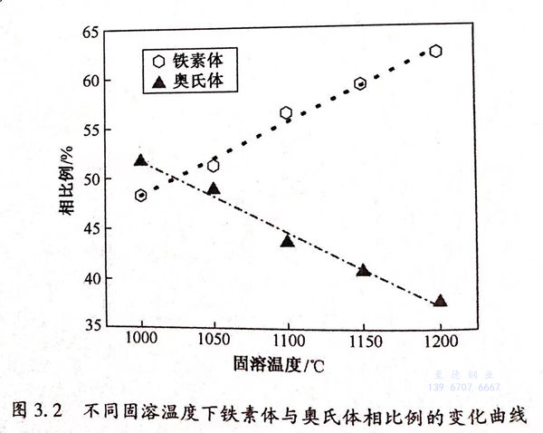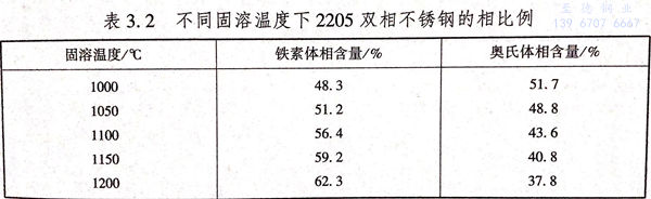 利(li)用IAS圖(tu)像分析(xi)軟件測量(liang)并計算相(xiang)比例(li),每個熱(re)處理溫(wen)(wen)(wen)度(du)(du)下(xia)的(de)(de)金相(xiang)圖(tu)取8張計算,求(qiu)取平均值。表3.2給(gei)出(chu)了利(li)用IAS圖(tu)像分析(xi)軟件計算得(de)到不同固(gu)溶溫(wen)(wen)(wen)度(du)(du)溫(wen)(wen)(wen)度(du)(du)下(xia)2205雙相(xiang)不銹鋼的(de)(de)相(xiang)比例(li)。1000℃時,鐵(tie)素體(ti)含量(liang)為48.3%,隨著固(gu)溶溫(wen)(wen)(wen)度(du)(du)的(de)(de)升高,鐵(tie)素體(ti)相(xiang)含量(liang)增(zeng)加,奧氏(shi)體(ti)相(xiang)含量(liang)下(xia)降,直到1200℃時,鐵(tie)素體(ti)含量(liang)達到62.3%,奧氏(shi)體(ti)含量(liang)僅占37.7%.這種鐵(tie)素體(ti)與奧氏(shi)體(ti)隨固(gu)溶溫(wen)(wen)(wen)度(du)(du)的(de)(de)變(bian)化規律前(qian)人的(de)(de)研(yan)究結果(guo)相(xiang)一致。兩(liang)相(xiang)比例(li)的(de)(de)變(bian)化曲線(xian)如(ru)圖(tu)3.2所示,兩(liang)相(xiang)與溫(wen)(wen)(wen)度(du)(du)的(de)(de)關系呈(cheng)線(xian)性變(bian)化。當固(gu)溶溫(wen)(wen)(wen)度(du)(du)約為1040℃時,其相(xiang)比例(li)為1:1。