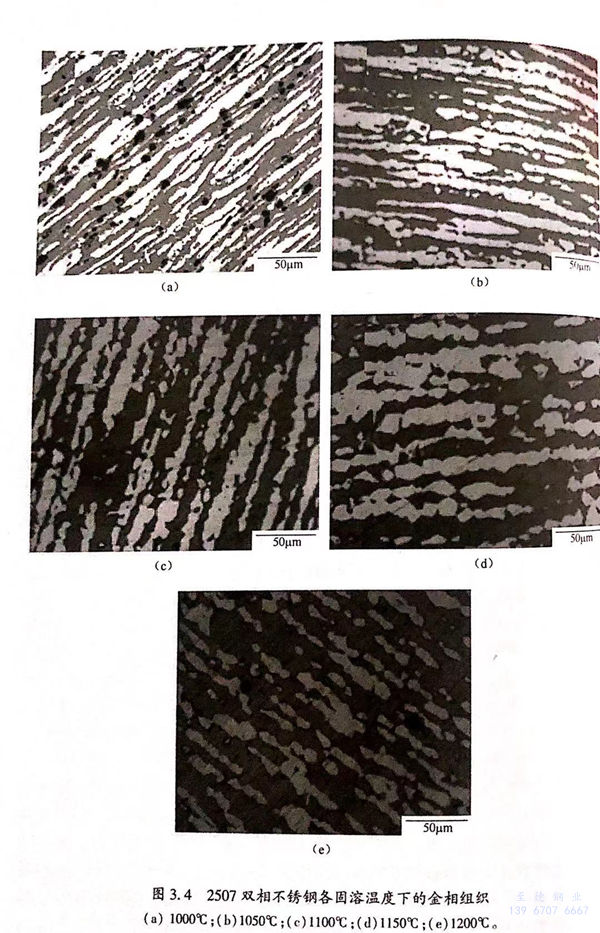 從圖3.3可知,2205雙相不銹鋼的顯微硬度先下降,后上升。這主要是由于當溫度為1000℃時,鐵素體相中間夾雜著小塊狀的二次奧氏體,當溫度達到1050℃后,二次奧氏體含量減少,組織均勻化程度提高,硬度減小。在此之后,隨著固溶溫度的增加,奧氏體含量減少,具有體心立方結構的奧氏體相屬于軟軔相,具有面心立方結構的鐵素體是強硬相,因此材料顯微硬度值又升高。同樣對2507雙相不銹鋼(gang)進行不同溫度的固溶處理會導致2507雙相不銹鋼兩相組織的改變,進而導致其性能的差異,以下是2507雙相不銹鋼在不同溫度下固溶處理后的微觀組織。