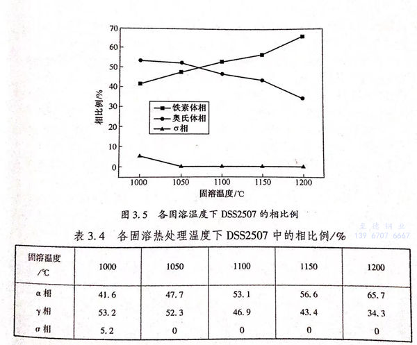 2507雙(shuang)相(xiang)(xiang)(xiang)不(bu)銹鋼(gang)(gang)中的(de)(de)(de)(de)奧(ao)氏(shi)體(ti)相(xiang)(xiang)(xiang)和鐵(tie)素體(ti)相(xiang)(xiang)(xiang)這(zhe)兩(liang)種相(xiang)(xiang)(xiang)的(de)(de)(de)(de)相(xiang)(xiang)(xiang)比例(li)(li)主要(yao)受固(gu)(gu)溶(rong)(rong)(rong)(rong)處理(li)工藝以及(ji)自(zi)身(shen)化(hua)學成(cheng)分(fen)的(de)(de)(de)(de)影(ying)響,當鋼(gang)(gang)的(de)(de)(de)(de)主要(yao)化(hua)學成(cheng)分(fen)確定時(shi),則(ze)兩(liang)相(xiang)(xiang)(xiang)比例(li)(li)與固(gu)(gu)溶(rong)(rong)(rong)(rong)處理(li)制度(du)有著密(mi)切聯系。DSS2507的(de)(de)(de)(de)相(xiang)(xiang)(xiang)比例(li)(li)又影(ying)響著其(qi)自(zi)身(shen)的(de)(de)(de)(de)性(xing)(xing)(xing)能(neng),其(qi)塑性(xing)(xing)(xing)隨著鐵(tie)素體(ti)含(han)(han)量的(de)(de)(de)(de)增多而減弱、耐(nai)應力(li)腐蝕破裂(lie)能(neng)力(li)隨著奧(ao)氏(shi)體(ti)含(han)(han)量升(sheng)高而減弱,進(jin)而認為(wei)當鐵(tie)素體(ti)α相(xiang)(xiang)(xiang)跟(gen)(gen)奧(ao)氏(shi)體(ti)γ相(xiang)(xiang)(xiang)這(zhe)兩(liang)相(xiang)(xiang)(xiang)相(xiang)(xiang)(xiang)比例(li)(li)接近(jin)1:1時(shi)雙(shuang)相(xiang)(xiang)(xiang)不(bu)銹鋼(gang)(gang)的(de)(de)(de)(de)綜合(he)性(xing)(xing)(xing)能(neng)最佳,有較好(hao)的(de)(de)(de)(de)抗腐蝕能(neng)力(li)以及(ji)較優的(de)(de)(de)(de)力(li)學性(xing)(xing)(xing)能(neng)。從(cong)圖(tu)3.5可(ke)知固(gu)(gu)溶(rong)(rong)(rong)(rong)熱處理(li)溫(wen)度(du)在1050~1100℃之間(jian)時(shi)可(ke)以使鋼(gang)(gang)中的(de)(de)(de)(de)兩(liang)相(xiang)(xiang)(xiang)組織(zhi)比例(li)(li)達(da)(da)到1:1,本(ben)實驗(yan)中所選用的(de)(de)(de)(de)5種固(gu)(gu)溶(rong)(rong)(rong)(rong)溫(wen)度(du)中1050℃時(shi)鐵(tie)素體(ti)α相(xiang)(xiang)(xiang)跟(gen)(gen)奧(ao)氏(shi)體(ti)γ相(xiang)(xiang)(xiang)比例(li)(li)最接近(jin)1:1,進(jin)而可(ke)以認為(wei)選擇較優的(de)(de)(de)(de)固(gu)(gu)溶(rong)(rong)(rong)(rong)熱處理(li)溫(wen)度(du)使DSS2507中的(de)(de)(de)(de)兩(liang)相(xiang)(xiang)(xiang)含(han)(han)量比例(li)(li)達(da)(da)到1:1是(shi)有可(ke)能(neng)的(de)(de)(de)(de),在實際應用過(guo)程中為(wei)了使2507雙(shuang)相(xiang)(xiang)(xiang)不(bu)銹鋼(gang)(gang)獲得較好(hao)的(de)(de)(de)(de)綜合(he)性(xing)(xing)(xing)能(neng),進(jin)行固(gu)(gu)溶(rong)(rong)(rong)(rong)處理(li)時(shi)選取的(de)(de)(de)(de)固(gu)(gu)溶(rong)(rong)(rong)(rong)溫(wen)度(du)應該在1050~1100℃之間(jian)。