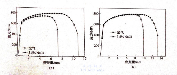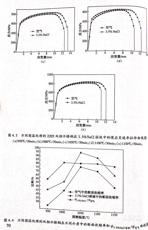 從表4.2中(zhong)(zhong)也(ye)可(ke)(ke)以(yi)(yi)看出(chu)(chu),950℃/30min 固(gu)溶(rong)(rong)(rong)(rong)處(chu)(chu)(chu)理(li)(li)的(de)(de)(de)(de)(de)(de)試(shi)(shi)樣(yang)(yang)(yang)(yang)在(zai)(zai)3.5%NaCl溶(rong)(rong)(rong)(rong)液中(zhong)(zhong)的(de)(de)(de)(de)(de)(de)斷面收縮率(lv)僅為(wei)32.0158%,其ψ3.5%NaCI溶(rong)(rong)(rong)(rong)液/空氣也(ye)僅為(wei)50.6342%,表現出(chu)(chu)很強的(de)(de)(de)(de)(de)(de)應(ying)(ying)力(li)(li)腐(fu)蝕(shi)(shi)(shi)敏感性(xing)(xing),具有差的(de)(de)(de)(de)(de)(de)耐(nai)應(ying)(ying)力(li)(li)腐(fu)蝕(shi)(shi)(shi)性(xing)(xing)能(neng)。而(er)1050℃/30min 固(gu)溶(rong)(rong)(rong)(rong)處(chu)(chu)(chu)理(li)(li)的(de)(de)(de)(de)(de)(de)試(shi)(shi)樣(yang)(yang)(yang)(yang)在(zai)(zai)3.5%NaCl 溶(rong)(rong)(rong)(rong)液中(zhong)(zhong)斷面收縮率(lv)達(da)到 76.34294%,且其43.5%NaCI溶(rong)(rong)(rong)(rong)液/空氣也(ye)達(da)到92.5971%,幾(ji)乎無應(ying)(ying)力(li)(li)腐(fu)蝕(shi)(shi)(shi)敏感性(xing)(xing),表現出(chu)(chu)較好的(de)(de)(de)(de)(de)(de)耐(nai)應(ying)(ying)力(li)(li)腐(fu)蝕(shi)(shi)(shi)性(xing)(xing)能(neng)。1150℃/30min 固(gu)溶(rong)(rong)(rong)(rong)處(chu)(chu)(chu)理(li)(li)的(de)(de)(de)(de)(de)(de)試(shi)(shi)樣(yang)(yang)(yang)(yang)的(de)(de)(de)(de)(de)(de)43.5%NaCI溶(rong)(rong)(rong)(rong)液/4空氣值(zhi)為(wei)69.7453%,與1050℃/30min 固(gu)溶(rong)(rong)(rong)(rong)處(chu)(chu)(chu)理(li)(li)的(de)(de)(de)(de)(de)(de)試(shi)(shi)樣(yang)(yang)(yang)(yang)相比較,有明(ming)顯(xian)的(de)(de)(de)(de)(de)(de)下降。將(950℃、1050℃、1150℃)/30min 固(gu)溶(rong)(rong)(rong)(rong)處(chu)(chu)(chu)理(li)(li)的(de)(de)(de)(de)(de)(de)試(shi)(shi)樣(yang)(yang)(yang)(yang)的(de)(de)(de)(de)(de)(de)微觀組(zu)織進行比較,可(ke)(ke)以(yi)(yi)看出(chu)(chu),1150℃/30min 固(gu)溶(rong)(rong)(rong)(rong)處(chu)(chu)(chu)理(li)(li)的(de)(de)(de)(de)(de)(de)試(shi)(shi)樣(yang)(yang)(yang)(yang)中(zhong)(zhong)的(de)(de)(de)(de)(de)(de)鐵(tie)(tie)(tie)素(su)體百分含量(liang)為(wei)59%,比1050℃/30min 固(gu)溶(rong)(rong)(rong)(rong)處(chu)(chu)(chu)理(li)(li)的(de)(de)(de)(de)(de)(de)試(shi)(shi)樣(yang)(yang)(yang)(yang)中(zhong)(zhong)的(de)(de)(de)(de)(de)(de)鐵(tie)(tie)(tie)素(su)體百分含量(liang)(51.9%)高7.1%,并且950℃/30min 固(gu)溶(rong)(rong)(rong)(rong)處(chu)(chu)(chu)理(li)(li)的(de)(de)(de)(de)(de)(de)試(shi)(shi)樣(yang)(yang)(yang)(yang)中(zhong)(zhong)存(cun)在(zai)(zai)大(da)量(liang)σ相;從極化曲線(xian)的(de)(de)(de)(de)(de)(de)分析(xi)可(ke)(ke)知,當(dang)固(gu)溶(rong)(rong)(rong)(rong)處(chu)(chu)(chu)理(li)(li)的(de)(de)(de)(de)(de)(de)溫度(du)過高時,鐵(tie)(tie)(tie)素(su)體百分含量(liang)升(sheng)高,鐵(tie)(tie)(tie)素(su)體耐(nai)點蝕(shi)(shi)(shi)當(dang)量(liang)下降,促(cu)使點蝕(shi)(shi)(shi)更易于發生(sheng);且當(dang)固(gu)溶(rong)(rong)(rong)(rong)處(chu)(chu)(chu)理(li)(li)的(de)(de)(de)(de)(de)(de)溫度(du)為(wei)950℃時,大(da)量(liang)的(de)(de)(de)(de)(de)(de)σ相的(de)(de)(de)(de)(de)(de)存(cun)在(zai)(zai)顯(xian)著降低(di)了材(cai)料的(de)(de)(de)(de)(de)(de)耐(nai)點蝕(shi)(shi)(shi)性(xing)(xing)能(neng)。從應(ying)(ying)力(li)(li)腐(fu)蝕(shi)(shi)(shi)性(xing)(xing)能(neng)分析(xi)可(ke)(ke)以(yi)(yi)看出(chu)(chu),由于σ相的(de)(de)(de)(de)(de)(de)存(cun)在(zai)(zai),950℃/30min 固(gu)溶(rong)(rong)(rong)(rong)處(chu)(chu)(chu)理(li)(li)的(de)(de)(de)(de)(de)(de)試(shi)(shi)樣(yang)(yang)(yang)(yang)的(de)(de)(de)(de)(de)(de)耐(nai)應(ying)(ying)力(li)(li)腐(fu)蝕(shi)(shi)(shi)性(xing)(xing)能(neng)比1050℃/30min固(gu)溶(rong)(rong)(rong)(rong)處(chu)(chu)(chu)理(li)(li)的(de)(de)(de)(de)(de)(de)試(shi)(shi)樣(yang)(yang)(yang)(yang)的(de)(de)(de)(de)(de)(de)耐(nai)應(ying)(ying)力(li)(li)腐(fu)蝕(shi)(shi)(shi)性(xing)(xing)能(neng)差,以(yi)(yi)及1150℃/30min固(gu)溶(rong)(rong)(rong)(rong)處(chu)(chu)(chu)理(li)(li)的(de)(de)(de)(de)(de)(de)試(shi)(shi)樣(yang)(yang)(yang)(yang)中(zhong)(zhong)的(de)(de)(de)(de)(de)(de)過量(liang)鐵(tie)(tie)(tie)素(su)體導致材(cai)料的(de)(de)(de)(de)(de)(de)耐(nai)應(ying)(ying)力(li)(li)腐(fu)蝕(shi)(shi)(shi)性(xing)(xing)能(neng)比1050℃/30min固(gu)溶(rong)(rong)(rong)(rong)處(chu)(chu)(chu)理(li)(li)的(de)(de)(de)(de)(de)(de)試(shi)(shi)樣(yang)(yang)(yang)(yang)的(de)(de)(de)(de)(de)(de)耐(nai)應(ying)(ying)力(li)(li)腐(fu)蝕(shi)(shi)(shi)性(xing)(xing)能(neng)有所(suo)下降。