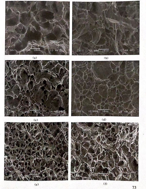 從(cong)圖4.5(a)、(b)中(zhong)可(ke)以(yi)看出,950℃/30min固(gu)溶(rong)(rong)(rong)(rong)處理(li)(li)(li)的(de)(de)(de)雙(shuang)相(xiang)(xiang)不(bu)銹(xiu)鋼(gang)在空氣(qi)中(zhong)和(he)溶(rong)(rong)(rong)(rong)液中(zhong)的(de)(de)(de)斷口均呈現準(zhun)解(jie)(jie)理(li)(li)(li)平面;950℃/30min 固(gu)溶(rong)(rong)(rong)(rong)處理(li)(li)(li)的(de)(de)(de)雙(shuang)相(xiang)(xiang)不(bu)銹(xiu)鋼(gang)在空氣(qi)中(zhong)的(de)(de)(de)斷口局部有少量(liang)韌窩存在,而(er)在溶(rong)(rong)(rong)(rong)液中(zhong)的(de)(de)(de)斷口幾乎(hu)是準(zhun)解(jie)(jie)理(li)(li)(li)平面,二者(zhe)都屬于脆性(xing)斷裂,這主要是由于大(da)量(liang)脆性(xing)σ相(xiang)(xiang)沿著晶界析出,降低了材料的(de)(de)(de)耐(nai)應力(li)(li)腐蝕(shi)(shi)性(xing)能(neng)和(he)力(li)(li)學性(xing)能(neng)。從(cong)圖4.5(e)、(f)中(zhong)可(ke)以(yi)看出,1050℃/30min固(gu)溶(rong)(rong)(rong)(rong)處理(li)(li)(li)的(de)(de)(de)雙(shuang)相(xiang)(xiang)不(bu)銹(xiu)鋼(gang)在空氣(qi)和(he)溶(rong)(rong)(rong)(rong)液中(zhong)的(de)(de)(de)斷口都存在大(da)量(liang)韌窩,雙(shuang)相(xiang)(xiang)不(bu)銹(xiu)鋼(gang)在溶(rong)(rong)(rong)(rong)液中(zhong)的(de)(de)(de)韌性(xing)損(sun)失(shi)較(jiao)小,而(er)(950℃、1000℃、1100℃、1150℃)/30min 固(gu)溶(rong)(rong)(rong)(rong)處理(li)(li)(li)的(de)(de)(de)雙(shuang)相(xiang)(xiang)不(bu)銹(xiu)鋼(gang)在溶(rong)(rong)(rong)(rong)液中(zhong)都存在較(jiao)大(da)的(de)(de)(de)韌性(xing)損(sun)失(shi),表(biao)明1050℃/30min 固(gu)溶(rong)(rong)(rong)(rong)處理(li)(li)(li)的(de)(de)(de)雙(shuang)相(xiang)(xiang)不(bu)銹(xiu)鋼(gang)具(ju)有較(jiao)好(hao)的(de)(de)(de)耐(nai)應力(li)(li)腐蝕(shi)(shi)性(xing)能(neng)。