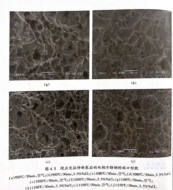 材料的應力腐蝕敏感性的強弱可以用其比值來反映:該值越大,材料的應力腐蝕敏感性越低。從圖4.4可以看出,隨著固溶處理的溫度的升高,雙相不銹鋼在空氣中的斷面收縮率先升高后下降,雙相不(bu)銹鋼在溶液中斷面收縮率先升高后下降,以及兩者之比(ψ環境/ψ空氣)的值先升高后下降,說明隨著固溶處理的溫度從950℃升高至1150℃,雙相不銹鋼的應力腐蝕敏感性先變弱后變強。