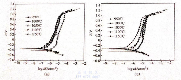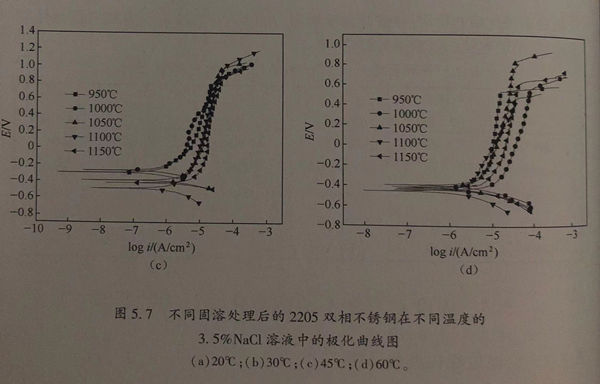 不同固溶處理后的2205雙相(xiang)不銹鋼在不同溫度的3.5%NaCl溶液中的極化曲線如圖5.7所示。