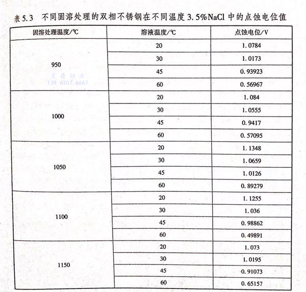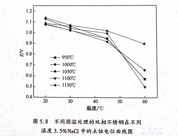 從(cong)圖5.8中可以看出,隨(sui)著(zhu)3.5%NaCl溶(rong)液(ye)的(de)(de)(de)溫(wen)度(du)的(de)(de)(de)升高,不(bu)同固(gu)(gu)溶(rong)處理(li)(li)(li)的(de)(de)(de)雙相(xiang)不(bu)銹(xiu)鋼(gang)的(de)(de)(de)點蝕電位(wei)(wei)(wei)下(xia)降(jiang)(jiang)。并且(qie)可以看出,當溫(wen)度(du)從(cong)20℃升高至45℃時(shi),不(bu)同固(gu)(gu)溶(rong)處理(li)(li)(li)的(de)(de)(de)雙相(xiang)不(bu)銹(xiu)鋼(gang)的(de)(de)(de)點蝕電位(wei)(wei)(wei)下(xia)降(jiang)(jiang)的(de)(de)(de)趨(qu)勢(shi)較為平緩;當3.5%NaCl溶(rong)液(ye)的(de)(de)(de)溫(wen)度(du)進一步升高至60℃時(shi),(950℃、1000℃、1100℃、1150℃)/30min固(gu)(gu)溶(rong)處理(li)(li)(li)的(de)(de)(de)雙相(xiang)不(bu)銹(xiu)鋼(gang)的(de)(de)(de)點蝕電位(wei)(wei)(wei)急劇下(xia)降(jiang)(jiang),而1050℃/30min固(gu)(gu)溶(rong)處理(li)(li)(li)的(de)(de)(de)雙相(xiang)不(bu)銹(xiu)鋼(gang)的(de)(de)(de)點蝕電位(wei)(wei)(wei)下(xia)降(jiang)(jiang)趨(qu)勢(shi)依然平緩,這(zhe)說明隨(sui)著(zhu)溶(rong)液(ye)溫(wen)度(du)的(de)(de)(de)升高,1050℃/30min 固(gu)(gu)溶(rong)處理(li)(li)(li)的(de)(de)(de)雙相(xiang)不(bu)銹(xiu)鋼(gang)的(de)(de)(de)點蝕敏(min)感(gan)性(xing)較低,且(qie)鈍化膜(mo)更加穩定。