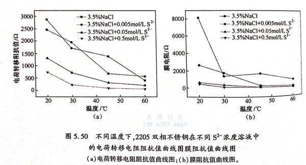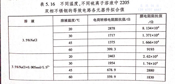 從圖5.50(a)中可以看出,在相同的溶液中,隨著溶液溫度的升高,雙相不銹鋼在溶液中的電荷轉移電阻阻抗值呈現下降的趨勢,說明隨著溶液溫度的升高,電化學反應的阻力越來越小,腐蝕越容易發生。在相同的溶液溫度下,隨著S2-的(de)(de)引入,雙相不銹(xiu)鋼(gang)電化(hua)學反應(ying)的(de)(de)電荷轉移(yi)電阻的(de)(de)阻抗值呈現(xian)下降的(de)(de)趨勢,并(bing)且溶液中的(de)(de)S2-濃度(du)越高,雙相不銹鋼電(dian)(dian)化學反應的電(dian)(dian)荷轉移電(dian)(dian)阻的阻抗(kang)值下(xia)降越明顯,說明了(le)S2-加快了腐蝕反應的速度,促進了腐蝕進一步發生。從圖5.50(b)中可以看出,在相同的溶液中,隨著溶液溫度的升高,雙相不銹鋼在溶液中形成的表面鈍化膜的膜阻抗值呈現下降的趨勢,說明隨著溶液溫度的升高,表面鈍化膜越來越不穩定。在相同的溶液溫度下,隨著S2-的引入,雙相不銹鋼在溶液中形成的表面鈍化膜的膜阻抗值呈現下降的趨勢,說明了S2-能夠破(po)壞鈍(dun)化膜的(de)穩(wen)定性,或者阻(zu)礙(ai)了鈍(dun)化膜的(de)形(xing)成。