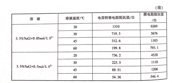 采用圖(tu)5.49所示(shi)的(de)(de)(de)等(deng)效電(dian)(dian)路(lu)圖(tu)進行(xing)阻(zu)(zu)抗(kang)(kang)擬合,得到如圖(tu)5.50和表5.16所示(shi)的(de)(de)(de)等(deng)效電(dian)(dian)路(lu)中電(dian)(dian)荷轉移電(dian)(dian)阻(zu)(zu)阻(zu)(zu)抗(kang)(kang)值(zhi)和膜電(dian)(dian)阻(zu)(zu)阻(zu)(zu)抗(kang)(kang)值(zhi)隨溶液溫(wen)度(du)變(bian)化的(de)(de)(de)關系圖(tu),以及不同溫(wen)度(du)下(xia)的(de)(de)(de)電(dian)(dian)荷轉移電(dian)(dian)阻(zu)(zu)阻(zu)(zu)抗(kang)(kang)值(zhi)和膜電(dian)(dian)阻(zu)(zu)阻(zu)(zu)抗(kang)(kang)值(zhi)的(de)(de)(de)數(shu)值(zhi)。