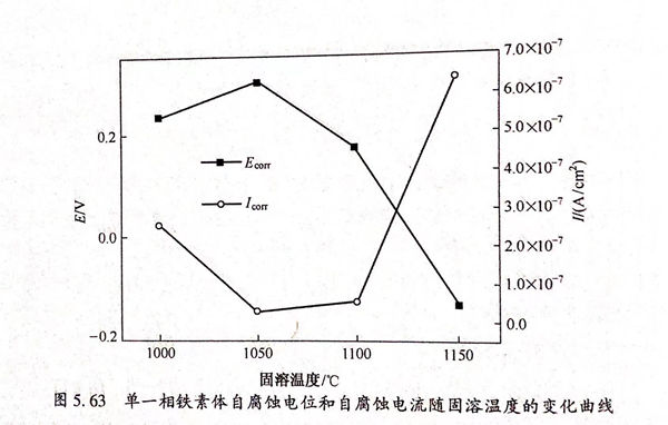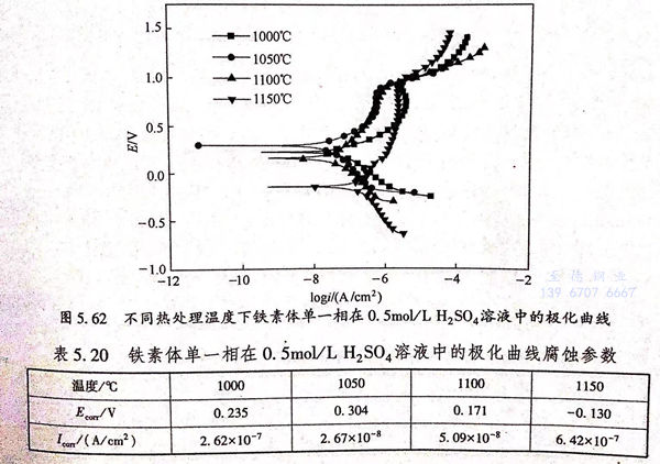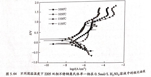 圖(tu)5.64為(wei)不同固(gu)溶(rong)溫(wen)(wen)度下(xia)2205 雙(shuang)相(xiang)不銹鋼奧氏體(ti)單一(yi)相(xiang)在(zai)0.5mol/L 硫酸溶(rong)液中(zhong)的(de)極化(hua)(hua)曲(qu)(qu)線(xian)(xian),奧氏體(ti)單一(yi)相(xiang)極化(hua)(hua)曲(qu)(qu)線(xian)(xian)形(xing)狀與鐵素體(ti)單一(yi)相(xiang)相(xiang)似,均沒有(you)雙(shuang)相(xiang)不銹鋼整(zheng)體(ti)在(zai)0.5mml/1.1,50,溶(rong)液中(zhong)出現(xian)的(de)法化(hua)(hua)鈍化(hua)(hua)區以及(ji)很寬的(de)純化(hua)(hua)區間。當固(gu)溶(rong)溫(wen)(wen)度較低(di)時,剪氏體(ti)單一(yi)相(xiang)極化(hua)(hua)曲(qu)(qu)線(xian)(xian)靠近圖(tu)的(de)左上方,隨(sui)著(zhu)固(gu)溶(rong)溫(wen)(wen)度的(de)升高,曲(qu)(qu)線(xian)(xian)向右(you)下(xia)方移動,其具(ju)體(ti)批合數據如表(biao)5.20折(zhe)列,自腐蝕電位和自腐蝕電流(liu)隨(sui)溫(wen)(wen)度的(de)變化(hua)(hua)曲(qu)(qu)線(xian)(xian)如圖(tu)5.65所(suo)示(shi)。