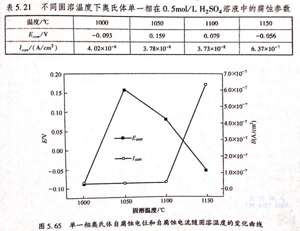 圖5.66為不(bu)同(tong)固(gu)溶(rong)(rong)(rong)(rong)溫(wen)度(du)下素體單(dan)(dan)一(yi)相(xiang)(xiang)與奧(ao)氏(shi)體單(dan)(dan)一(yi)相(xiang)(xiang)在(zai)(zai)(zai)硫(liu)酸(suan)溶(rong)(rong)(rong)(rong)液中(zhong)耐蝕(shi)(shi)性能的對比圖,從(cong)圖中(zhong)可以看出,固(gu)溶(rong)(rong)(rong)(rong)溫(wen)度(du)較(jiao)低(di)時,鐵(tie)(tie)素體單(dan)(dan)一(yi)相(xiang)(xiang)自(zi)(zi)腐蝕(shi)(shi)電(dian)(dian)位較(jiao)高(gao)。隨著溫(wen)度(du)的升高(gao),兩相(xiang)(xiang)自(zi)(zi)腐蝕(shi)(shi)電(dian)(dian)位差(cha)值變小,當固(gu)溶(rong)(rong)(rong)(rong)溫(wen)度(du)為1150℃時,奧(ao)氏(shi)體單(dan)(dan)一(yi)相(xiang)(xiang)自(zi)(zi)腐蝕(shi)(shi)電(dian)(dian)位較(jiao)鐵(tie)(tie)素體單(dan)(dan)一(yi)相(xiang)(xiang)略微提高(gao)。比較(jiao)不(bu)同(tong)固(gu)溶(rong)(rong)(rong)(rong)溫(wen)度(du)下的兩相(xiang)(xiang)的自(zi)(zi)腐蝕(shi)(shi)電(dian)(dian)流可以發現(xian)(xian),奧(ao)氏(shi)體單(dan)(dan)一(yi)相(xiang)(xiang)與鐵(tie)(tie)素體單(dan)(dan)一(yi)相(xiang)(xiang)的自(zi)(zi)腐蝕(shi)(shi)電(dian)(dian)流在(zai)(zai)(zai)不(bu)同(tong)固(gu)溶(rong)(rong)(rong)(rong)溫(wen)度(du)下都相(xiang)(xiang)差(cha)很(hen)小。相(xiang)(xiang)對在(zai)(zai)(zai)3.5%NaCl溶(rong)(rong)(rong)(rong)液,鐵(tie)(tie)素體單(dan)(dan)一(yi)相(xiang)(xiang)在(zai)(zai)(zai)0.5mol 硫(liu)酸(suan)溶(rong)(rong)(rong)(rong)液中(zhong)的腐蝕(shi)(shi)速率(lv)有(you)了很(hen)明顯的增(zeng)加,這(zhe)說明在(zai)(zai)(zai)0.5mol 硫(liu)酸(suan)溶(rong)(rong)(rong)(rong)液中(zhong),鐵(tie)(tie)素體單(dan)(dan)一(yi)相(xiang)(xiang)與奧(ao)氏(shi)體單(dan)(dan)一(yi)相(xiang)(xiang)都表現(xian)(xian)出了較(jiao)大的腐蝕(shi)(shi)活性,在(zai)(zai)(zai)宏觀上表現(xian)(xian)出均勻(yun)腐蝕(shi)(shi)的性質,其在(zai)(zai)(zai)0.5mol/L 硫(liu)酸(suan)溶(rong)(rong)(rong)(rong)液中(zhong)的優先腐蝕(shi)(shi)行為不(bu)明顯,這(zhe)與其在(zai)(zai)(zai)3.5%NaCl溶(rong)(rong)(rong)(rong)液中(zhong)的優先腐蝕(shi)(shi)行為明顯不(bu)同(tong)。
