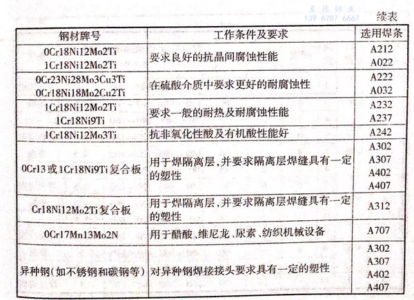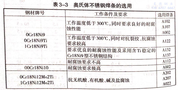 焊條應根據不(bu)銹(xiu)鋼的材質、工作條件(包括工作濕度和接觸介質等)來選用,鉻鎳奧氏體不銹鋼焊條的選用見表3-3。