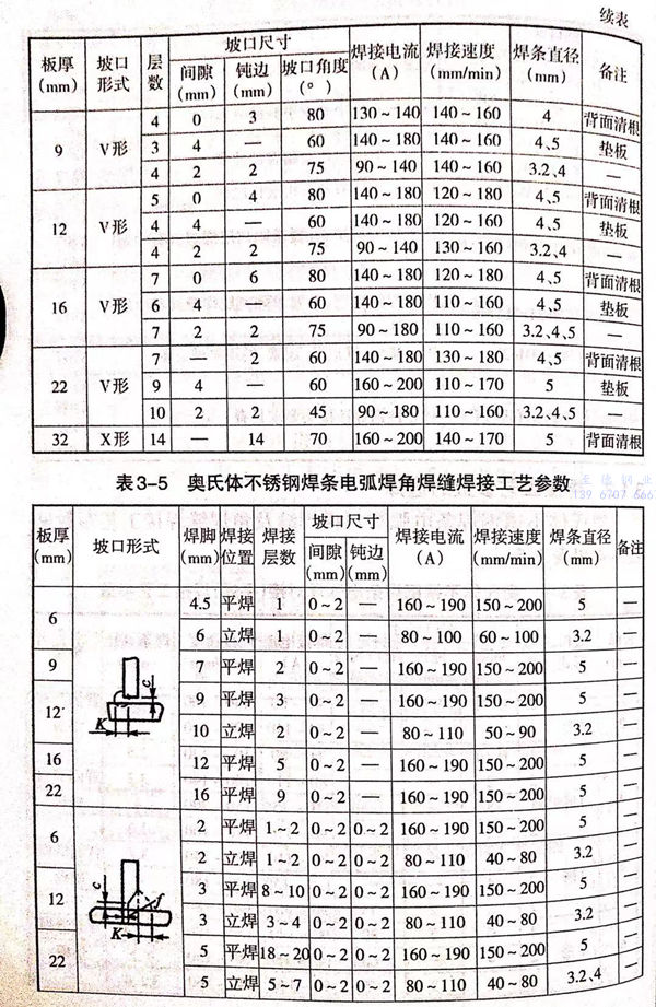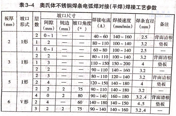 奧氏體(ti)不銹鋼焊(han)條(tiao)電弧焊(han)對接(jie)焊(han)縫(feng)及角(jiao)焊(han)焊(han)縫(feng)焊(han)接(jie)工藝參數見表 3-4 和(he) 表 3-5。