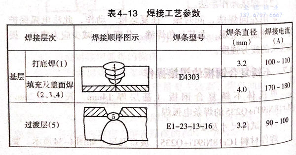 焊接材料:基層(ceng)(ceng)為(wei)E4303,直徑ф3.2mm、?4.0mm;過渡層(ceng)(ceng)為(wei)E1-23-13-16,ф3.2mm;覆層(ceng)(ceng)為(wei)E0-19-10Nb-16,Φ3.2mm。